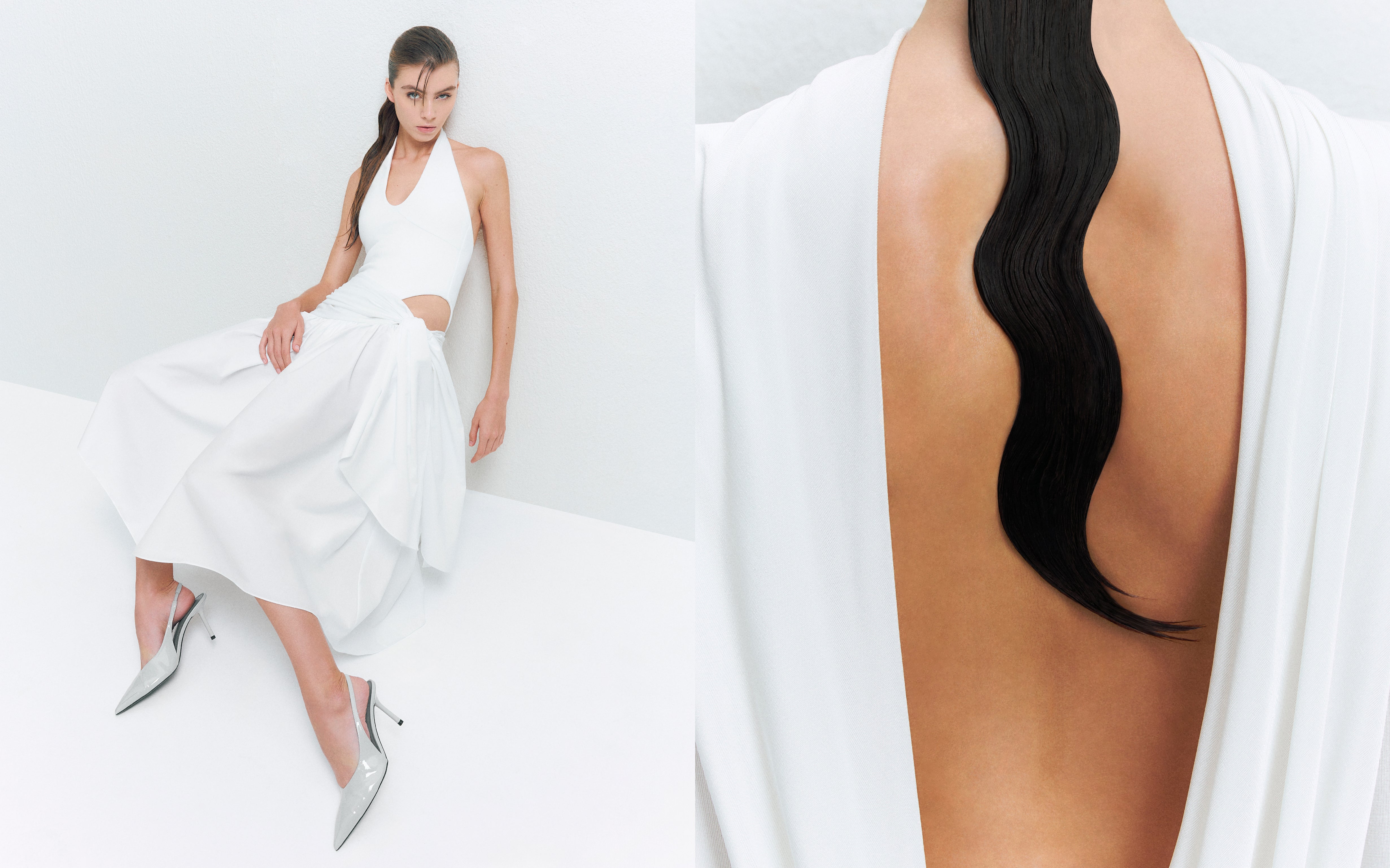 V-NECK PANELED BODYSUIT PAIRED WITH KNOT DETAIL MIDI SKIRT